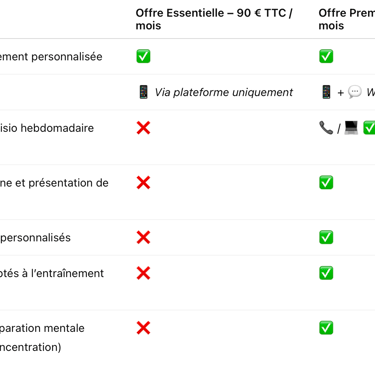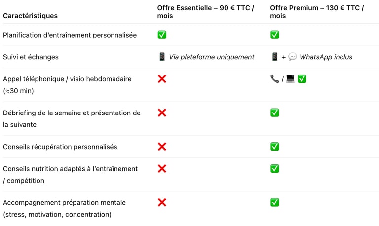 • Essentielle (90 € / mois) → Adaptée à ceux qui veulent uniquement une planification structurée et autonome, avec échanges via la plateforme d’entraînement.